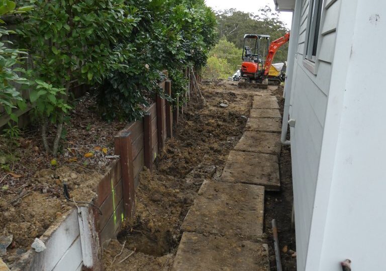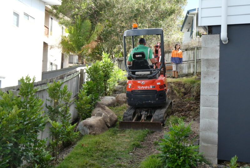 Day 10 – Friday 24th November The day of the retaining wall. …and now to the front of the house and the removal of plants below the main bedroom to make way for a wider