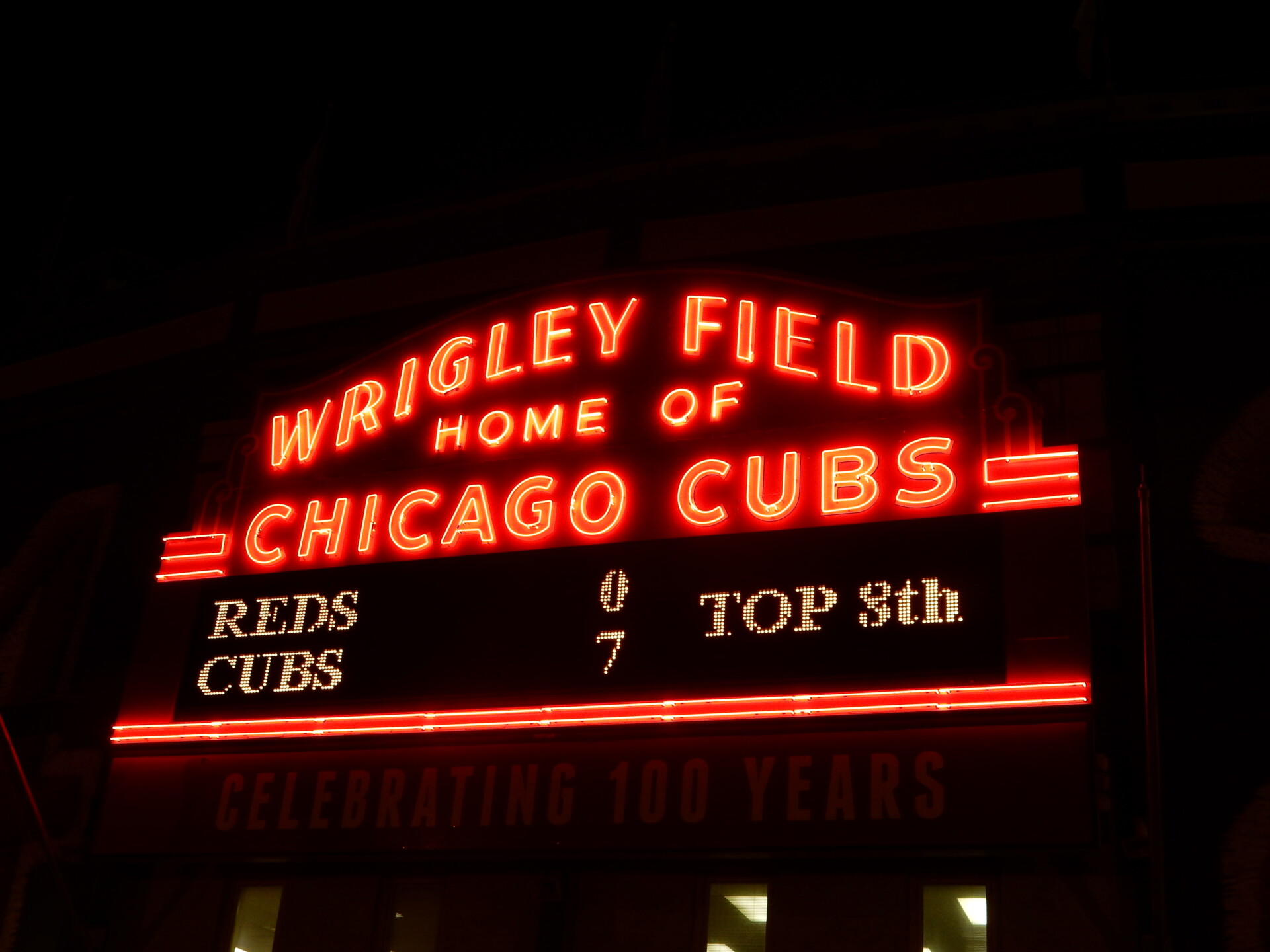 We trained it out with the locals to Wrigley Field (yes, after the man who made a fortune from chewing gum), to the home of the Chicago Cubs for our first ever ball game. For a Tuesday night they had a huge crowd. What we have managed to learn is that the ball teams play 3 games against the same team, over the space of 3 nights. In this case we went along to the 3rd night and watched the Cubs defeat the Cincinnati Reds 7 – 0 and we saw a ball smashed for a home run as well. It was the only one all night. All of the players have remarkable ball catching skills. Alas, the ball-hitting skills are not so good. In fact at one part Geoff declared that cricket (and test cricket at that) was possibly a faster paced game with a significantly higher scoring rate. Anyway the Reds pitcher was definitely off his game and eventually they subbed him off and found another replacement,